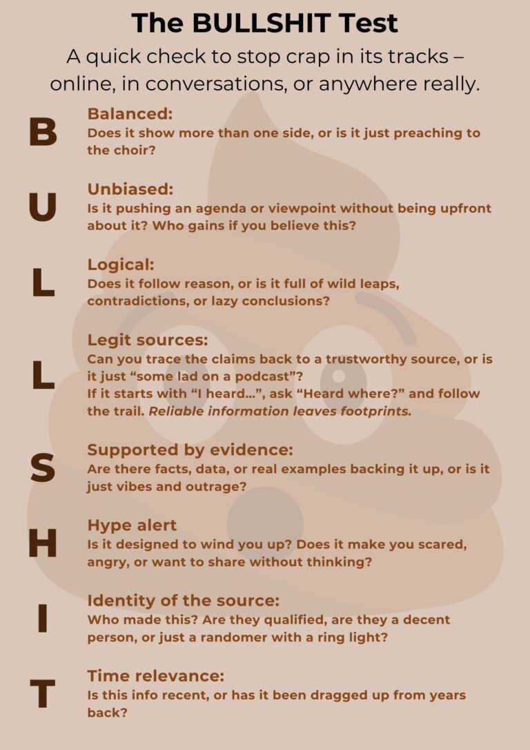 The BULLSHIT Test can help you tell the difference. It’s a quick way to slow down, question what you see, and avoid getting pulled into online manipulation.